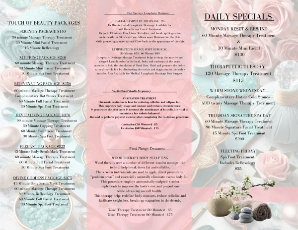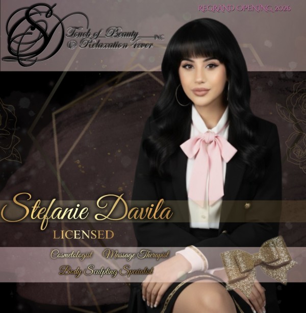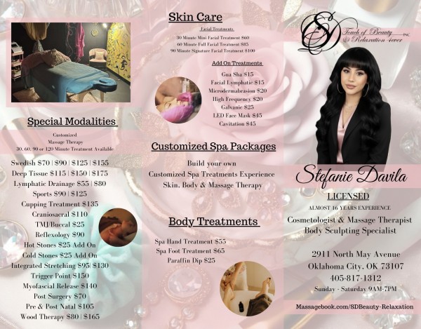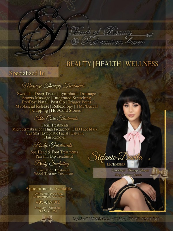 BEAUTY| HEALTH | WELLNESS Stefanie Davila is the creator & founder of SD Touch of Beauty & Relaxation 4ever inc. She is a Licensed Cosmetologist, Massage Therapist & Body Sculpting Specialist with Almost 16 Years experience in beauty, health and wellness, specializing in skin, body, massage therapy & body contour, sculpting and wood therapy treatments. Founded in 2010 Stefanie has worked to create and expand her practice working in treatments for beauty, therapeutic and medical modalities with over 75 credited hours and certified in post-surgery body sculpting. She has worked as a Professional Makeup Artist, Stylist and Model where her work has been displayed in Print, Commercials and Fashion Shows. Working toward overall Health & Wellness, Stefanie has experience in special modalities for Swedish, Deep Tissue, Lymphatic Drainage, Pre & Post Natal as well as Post Surgery Massage, Wood Therapy & Cavitation Body Sculpting. Since 2012, Stefanie has been a local & traveling therapist in Oklahoma City, available for events, parties, couples and singles sessions while incorporate my expertise in Skin Care, Body Treatments and Massage Therapy for Relaxation and specific Health & Wellness for long term goals and overall healing. PLEASE NOTE: Click the website on the left for more updated pricing.